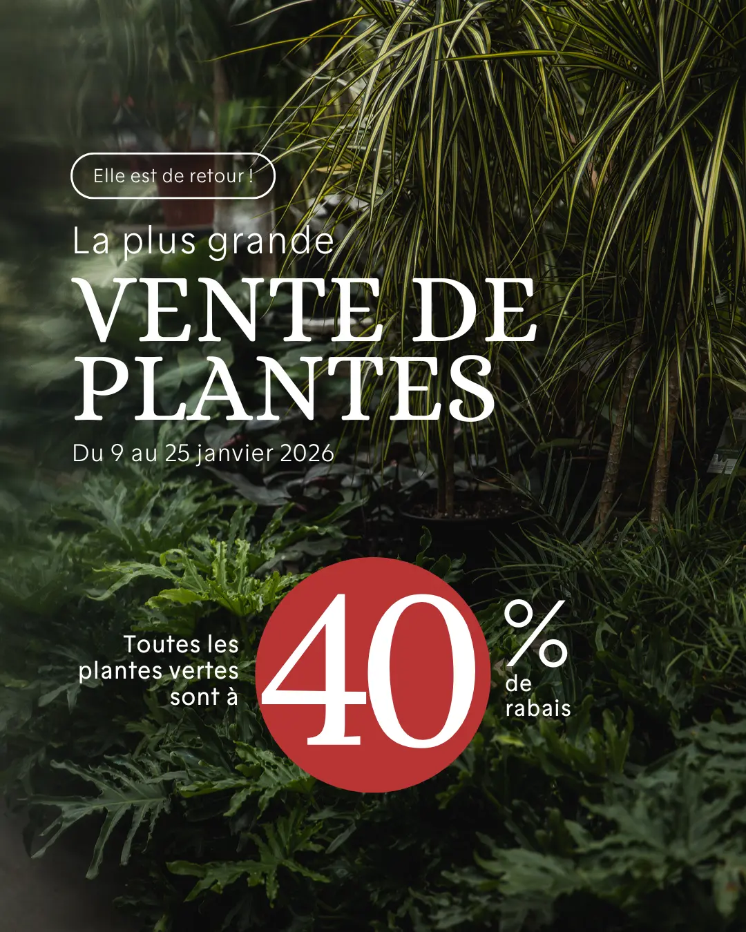 La plus grande vente de plantes vertes en Estrie est de retour! Profitez de notre liquidation de plantes d'intérieur du 9 au 25 janvier 2026. On a besoin de faire de la place pour notre grand ménage du printemps et bien repartir la saison à neuf, tout doit partir!!